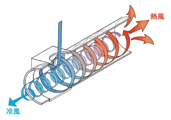 小型で場所を選ばず柔軟に活用でき、冷媒を使用しない環境に優しい仕様と高耐久性が大きな特徴です。この装置は可動部がなく、圧縮空気をチューブ内で高速回転させることで、冷風と熱風に分ける仕組みになっています。