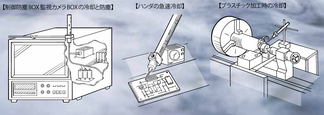 分けられた冷風は供給された空気の温度より最大で30℃~60℃冷たいジェット空気となり噴出します。
