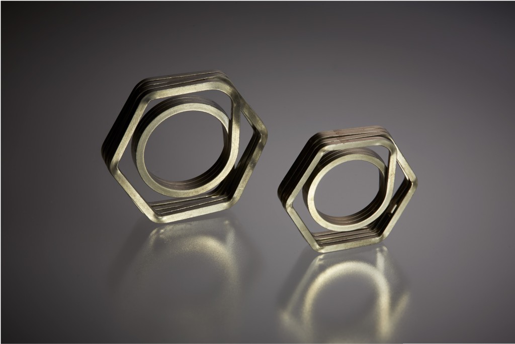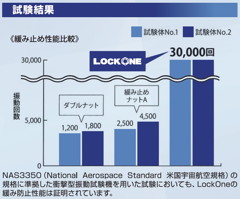 ロックワンは、ナットの後ろに取り付ける特殊形状のスプリングです。このスプリングの緊縮力を利用することで、小さな締め付け力でもボルト・ナットの回転を抑制、高い緩み止め効果を発揮します。